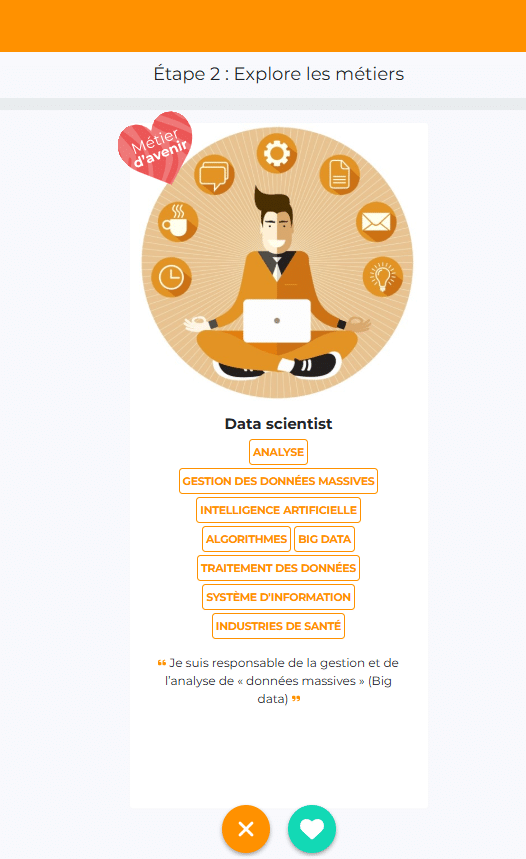 À ce stade du projet d’orientation, l’intérêt exprimé pour un métier ne signifie pas forcément qu’il s’agira du choix final. Les personnes qui réalisent le test explorent souvent des pistes très variées, ce qui est tout à fait normal à cette étape de réflexion.